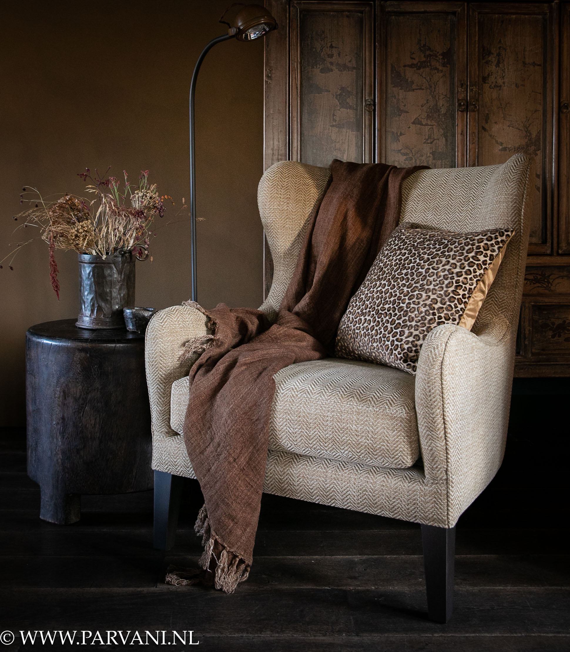 Comfortabele oorfauteuil model Galveston van Marie’s Corner met stoere bekleding in vacht/ koeienhuid