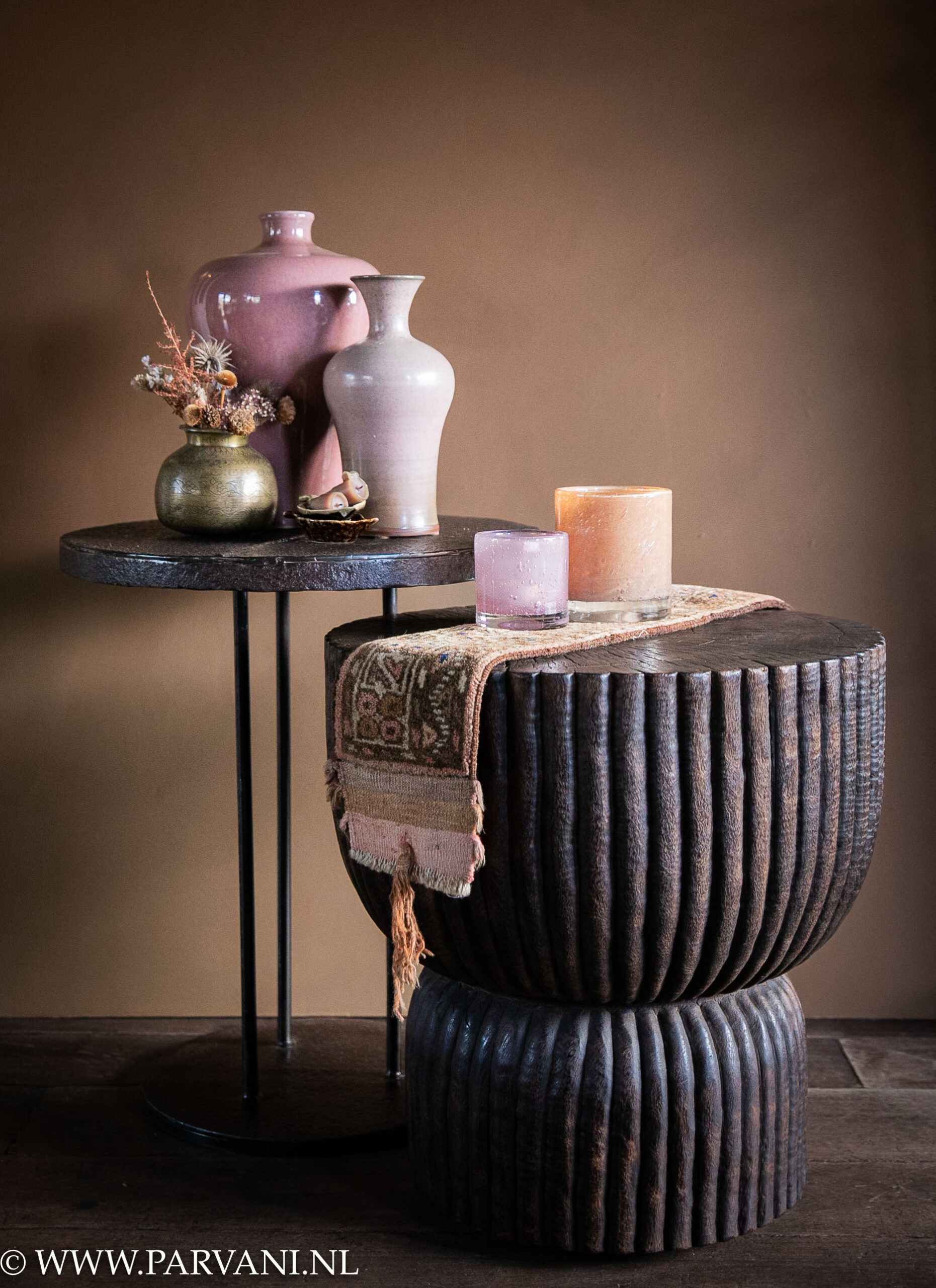 Ronde donkerbruine houten salontafel bijzetter met stoere ijzeren bijzettafel, vintage tafelloper Hoffz, roze vazen en glazen windlichten