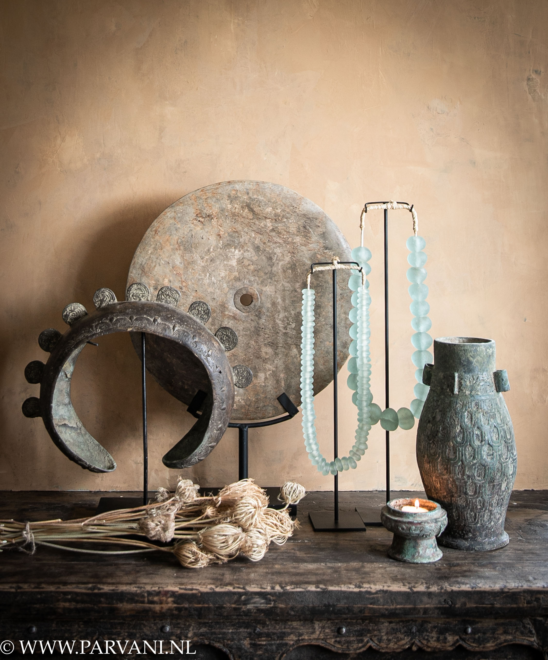 Stilleven met een mix aan woonaccessoires uit diverse landen. Achteraan een grote ronde bi-schijf op standaard, met prachtige kleuren en tekening in de steen. De diameter is 40cm en de totale hoogte 55cm, prijs €159,- Deze is afkomstig uit Indonesië. Links ervoor een grote unieke bronzen enkelband uit Congo, met mooie patina en accenten. Deze is 40cm hoog en 37cm breed, prijs €349,- Verder 2 Afrikaanse glaskettingen uit Ghana in zacht blauwgroene kleur, de kleine met plattere kralen is 42cm hoog en €69,- en de grote is 50 cm hoog, prijs €109,- Meest rechts een bronzen vaas met bijzonder patroon en details, en ook weer een prachtig patina. De deksel hebben we er even voor gelegd en omgedraaid, zo is deze leuk te gebruiken om een kaarsje in te branden. De vaas is 36 cm hoog en heeft een diameter van 14cm, prijs €399,-De achterwand hebben we met diverse kleuren kalkverf gespaand, om zo een mooie structuur en kleurschakering te krijgen. De toplaag is fresco in de kleur Golden Majesty, en ook deze is aangebracht met de spatel. Wil je meer weten over deze techniek, kom eens langs in de winkel, we helpen je graag met een goed advies.