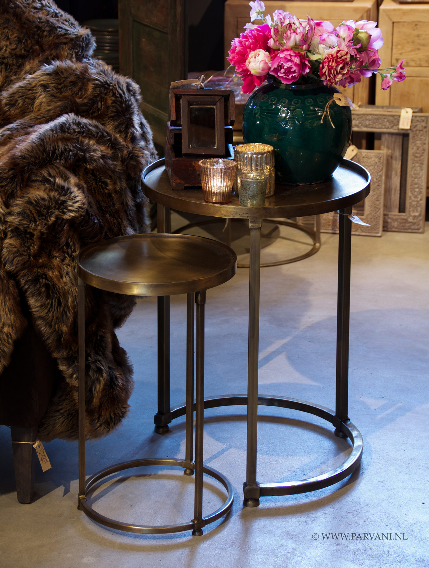 Ronde bijzettafels van brass, set van twee. Afmeting grote bijzettafel 45,5 cm doorsnede, 61 cm hoog. Afmeting kleine bijzettafel 30,5 cm doorsnede, 51 cm hoog. Prijs per set € 219,-