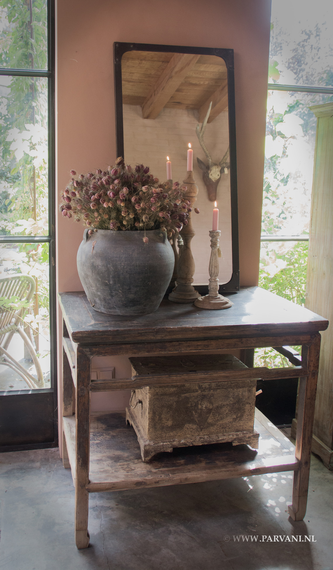 Oude Chinese wandtafel met mooie zwarte patina, de hoge tafel kan ook gebruikt worden in bijvoorbeeld de keuken als bartafel. Afmetingen: 94cm x 64cm x 83cm (bxdxh) Prijs: € 1295,- VERKOCHTDe spiegel heeft een ijzeren frame, afmetingen: 54cm x 107cm prijs: € 135,- Het ijzeren geldkistje is afkomstig uit India, afmetingen: 47cm x 34cm x 30cm (bxdxh) prijs: € 229,- Grijze Chinese kruik, prijs: € 179,- De kandelaren zijn afkomstig uit de collectie van Hoffz, in de winkel hebben wij een groot assortiment kandelaren van Hoffz.