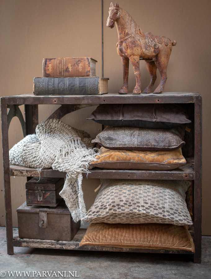 Stoere wandtafel gemaakt van oud ijzer met mooi doorleefd patina. De kant met de metalen boogjes kun je zowel voor als achter aanzicht zetten. Deze sidetable is 93cm breed, 38cm diep en 77cm hoog. De prijs is €349,-Erin een aantal kussens in velvet, linnen, vacht en suede in oker, naturel en bruintinten. Leuk om een mix te maken van effen kussens, een vachtje en een leopard print en erbij een grof geknoopt linnen plaid. We helpen je graag met het samenstellen van een mooie set.Verder in de sidetable 2 oude ijzeren kistjes, en erop een roestkleurig gietijzeren paard.Deze sidetables zijn multifunctioneel, gebruik hem als boekenkastje in de woonkamer, of vul hem met mooi servies in de keuken. Natuurlijk hebben we ook ook genoeg bijzondere accessoires in de winkel om erop/ erin te zetten. We denken hierin graag met je mee!