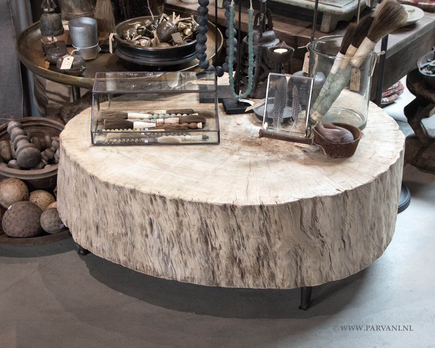 Massieve boomstam salontafel van mooie tropische houtsoort, mooi licht van kleur, en zwaar van gewicht op ijzeren pootjes. (VERKOCHT, in de winkel zijn er soortgelijke tafels verkrijgbaar) Leuk om te combineren met een of twee kleinere bijzettafeltjes.Diameter ongeveer 85-100 cm, hoogte 38 cm, prijs € 950,-