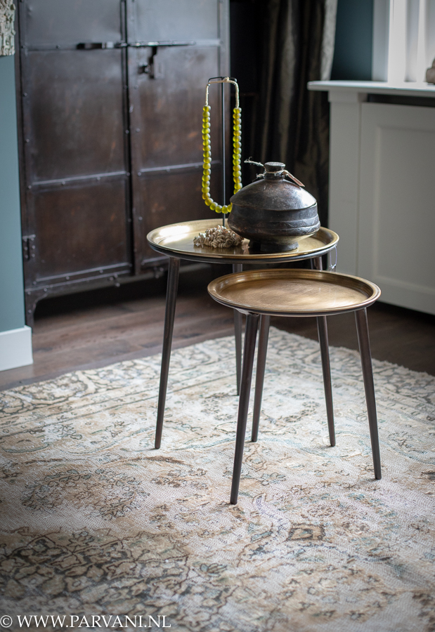 Set ronde bijzettafeltjes afgewerkt met goudkleurig blad en zwarte pootjes, Afmetingen van de ijzeren tafeltjes: 51cm hoog, doorsnede 47,5cm en 46cm hoog, doorsnede 38cm. Prijs: € 279,- De houten “,lozi bowl”, is afkomstig uit Afrika en is gebruikt als opdekschaal, prijs: € 89,- De groene glazen ketting op standaard is afkomstig uit Ghana, prijs: € 69,- Bosje geregen cowry schelpjes, prijs: € 29,95