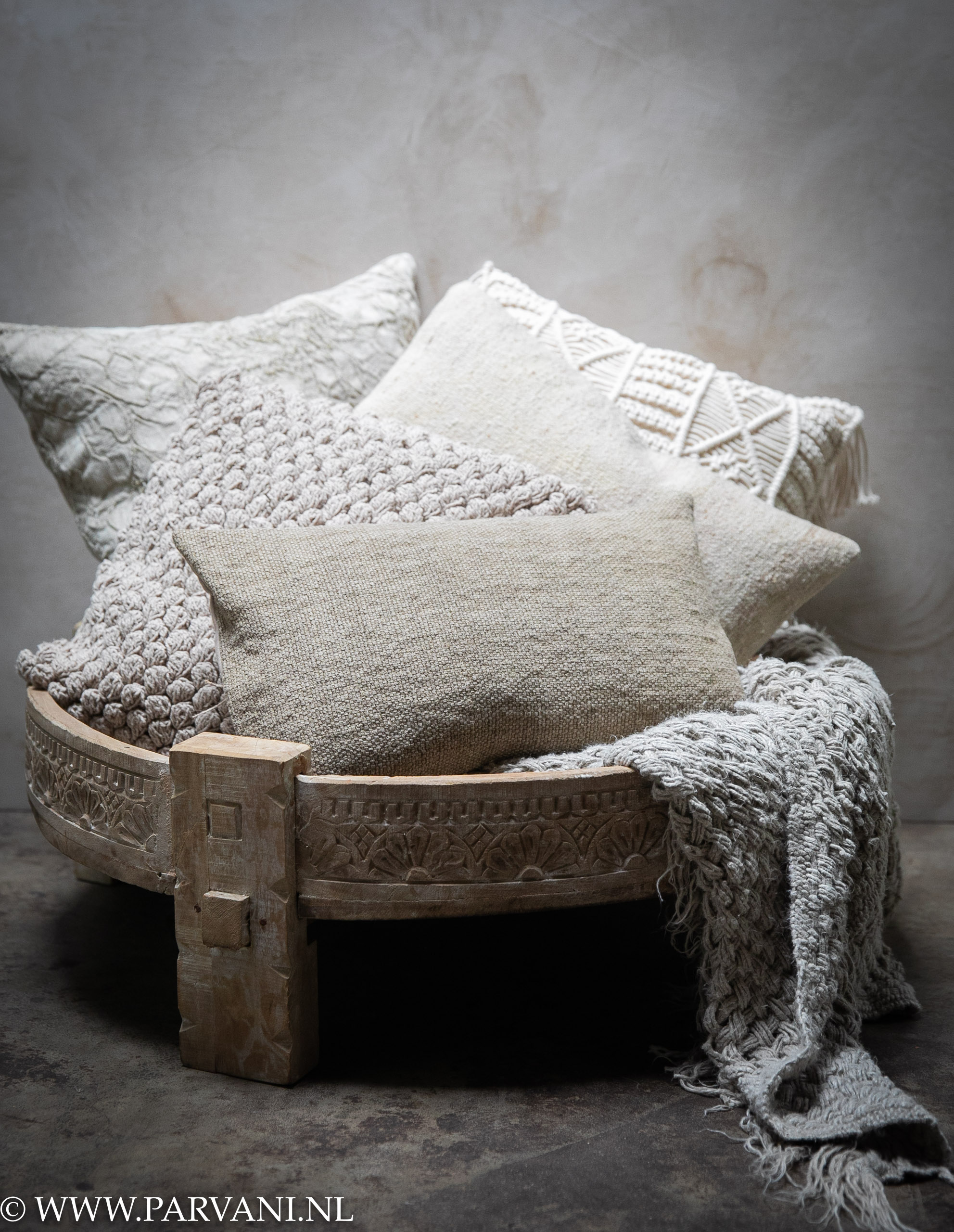 Oude Chakkitafel / maalsteentafel uit India in lichte houtkleur met mooi snijwerk, diameter 77 cm, prijs €279,- Daarin een grof geweven linnen plaid uit de collectie van Hoffz, in lichte naturelle kleur, prijs €209,- Voorste kussen 30×,50 cm in stof Maska, prijs vd hoes €49,-, erachter een vierkant kussen met geknoopte bolletjes in beige tint, 50x 50 cm, prijs €24,95. Daarachter een unieke kelimkussen hoes 30x50cm, prijs €50,- Rechtsachter een macramé kussen met franjes in afmeting 50×,50 cm, prijs €32,50 En linksachter een kussen in stof Kinta in afmeting 50×,50 cm, prijs van de hoes €63,-.