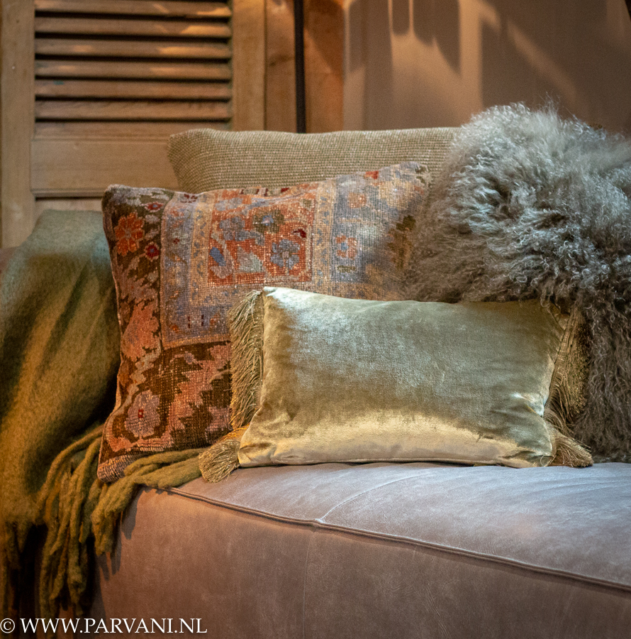 Groen/bruin wollen plaid met franjes 130cm x 170cm prijs: € 69,- Groot kussen gehaakt uit de collectie van Duran 45cm x 65cm prijs: € 193,- Vintage carpet kussen 50cm x 50cm prijs: € 95,- Kussen van lamsvacht in groene kleur 50cm x 50cm prijs: € 95,- Kussen uit de collectie van Duran glansstof met franjes 30cm x 45cm prijs: € 150,-