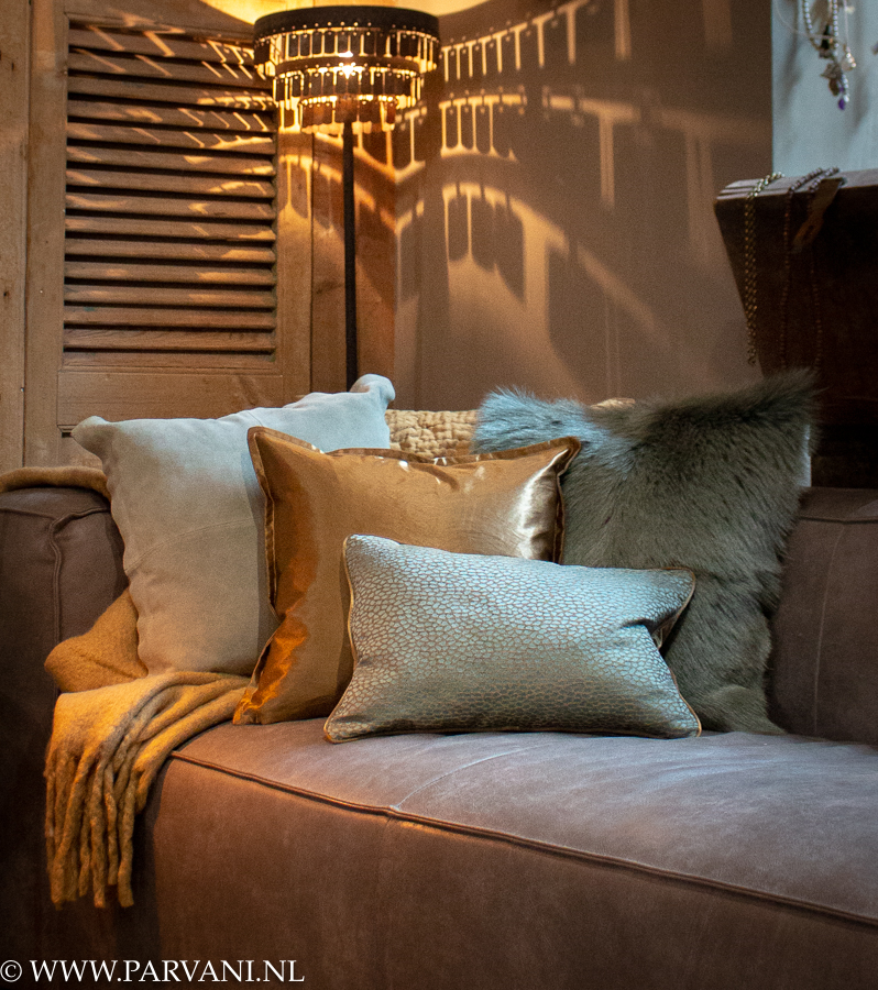 Wollen plaid met franjes 130cm x 170cm prijs: € 59,95 Suede kussen 50cm x 50cm prijs: € 52,50 Kussen met geitenvacht in petrol kleur, 50cm x 50cm prijs: € 95,- Gouden kussenhoes in glansstof 50cm x 50cm prijs: € 61,- Kussenhoes met dierenprint in blauw/goud 30cm x 50cm prijs: € 79,-
