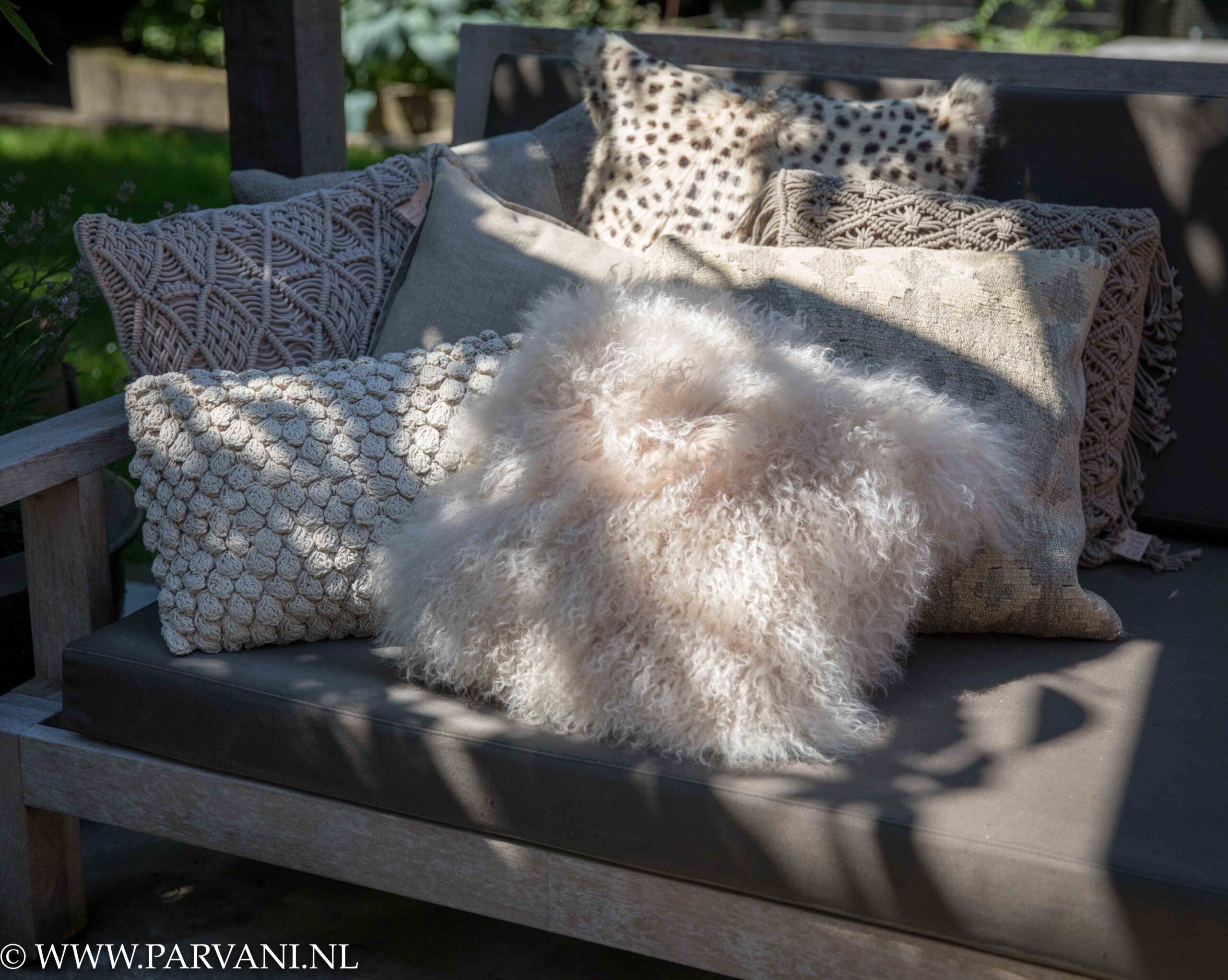 Verschillende kussens, naturel/beige, Macrame, geknoopt, gehaakt, geitenvacht, Mongools lamsvacht.