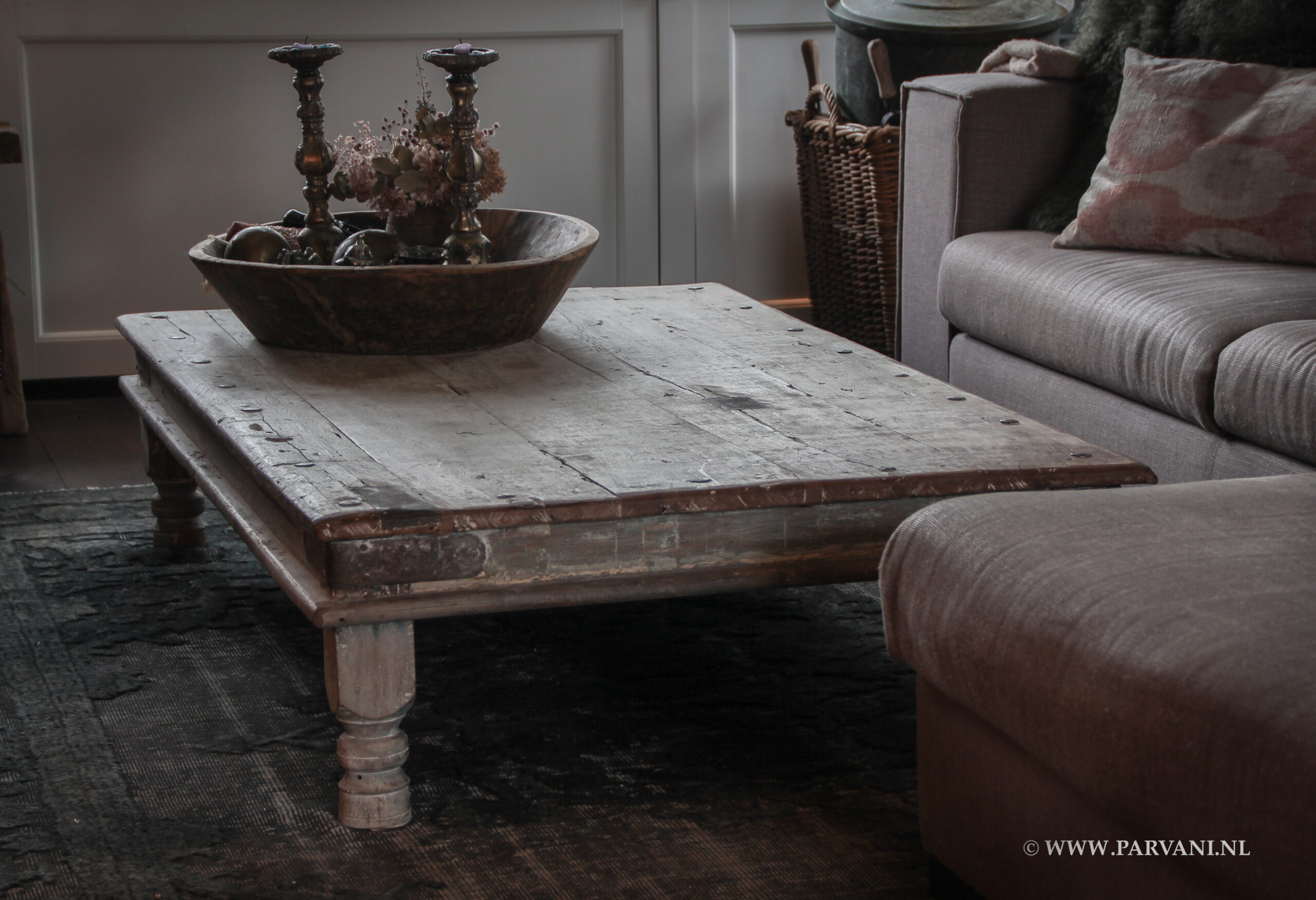 Grote oude salontafel uit India in een lichte vergrijsde kleur met mooi ijzer beslag, de tafel op de foto is verkocht. Soortgelijke tafels zijn verkrijgbaar in verschillende afmetingen, prijs op aanvraag