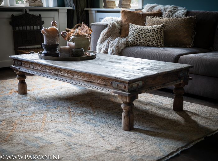 India salontafel met mooi snijwerk, vergrijsd patina en stoer ijzerbeslag op de hoeken. De afmeting van deze tafel is 76x151x37 cm, prijs €895,- VERKOCHT