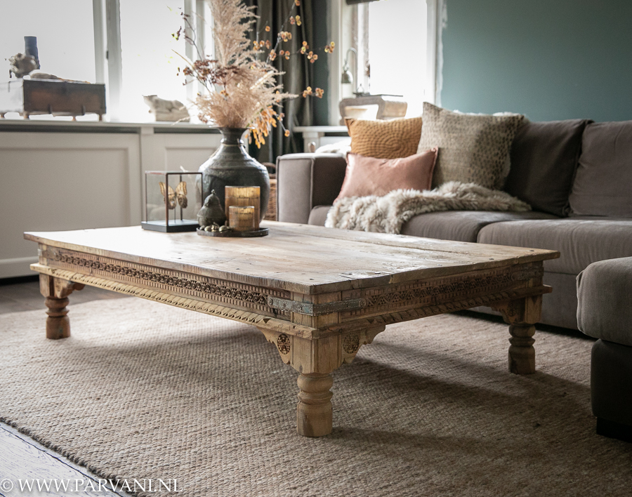 Robuuste doorleefde India salontafel met mooi houtsnijwerk en stoer metalen beslag op de randen. De afmeting van deze tafel is 96x160x37cm (bxlxh), en de tafel heeft een warme vergrijsde tint. De prijs van deze tafel is €1395,- VERKOCHT! Erop staat een oude koperen vaas uit Nepal €329,- en een vierkante stolp met vlinder €109,-
