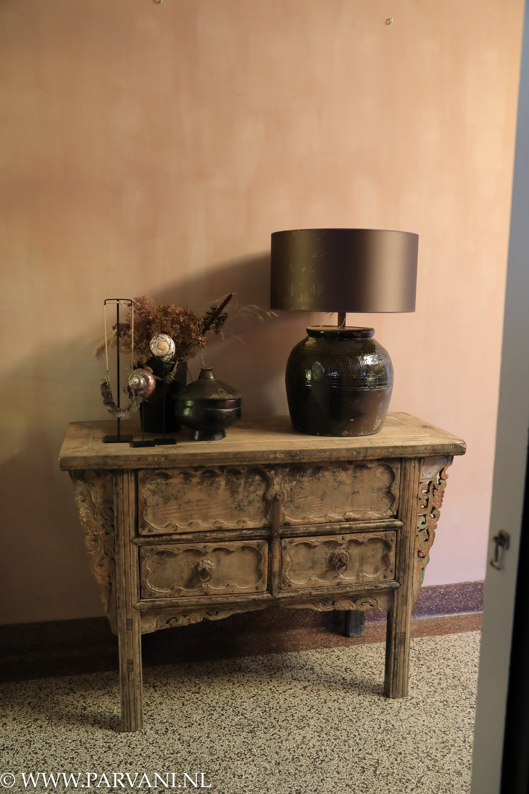 Oude houten sidetable uit China (Shanxi) met 3 grote lades en mooi snijwerk aan de zijkanten en mooie details. Het heeft een naturelle, redelijk lichte kleur hout, en de afmeting is 119x47x85 cm (bxdxh) en de prijs is €1450,- Erg leuk om toe te passen in een hal of badkamer.Erop een lampvoet in donker bruin/ zwarte kleur glazuur, ook afkomstig uit China, met bewerkte bovenrand met stipjes en streepjes. De hoogte van deze voet tot bovenrand van de pot is 32,5cm, de diameter 33cm en de hoogte inclusief kap is 61cm. De prijs van de lampvoet is €329,- Kappen in vel soorten, maten en kleuren te bestellen.Links een houten raita beker uit Nepal met gedroogde bloemen €135,- een ketting met oude munten op standaard uit India, en mooie gepolijste slakken op standaard, prijs vanaf €42,50