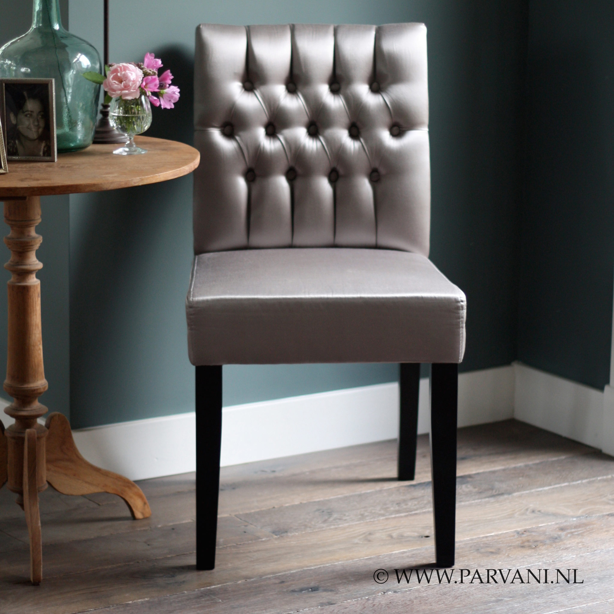 Eetkamerstoel model Le bistro uit de collectie van interiors DMF. Afmetingen: 50cm x 54cm x 88cm (bxdxh) de zithoogte is 48cm. Hier afgebeeld in een gecapitonneerde stof, Tevens is de stoel leverbaar met losse hoes, armleuningen en zonder capiton. Prijs zoals afgebeeld: € 635,- deze prijs gebaseerd op de glansstof “,Raju”,, waar de stoel op de foto mee bekleed is. In de winkel is er een grote collectie aan stofstalen aanwezig. De uiteindelijke prijs van het meubel, hangt dus af van de stof keuze. Tevens is in dit model een eetkamerbank leverbaar. Tevens is in de Le bistro ook een eetkamerbank leverbaar in diverse maten.