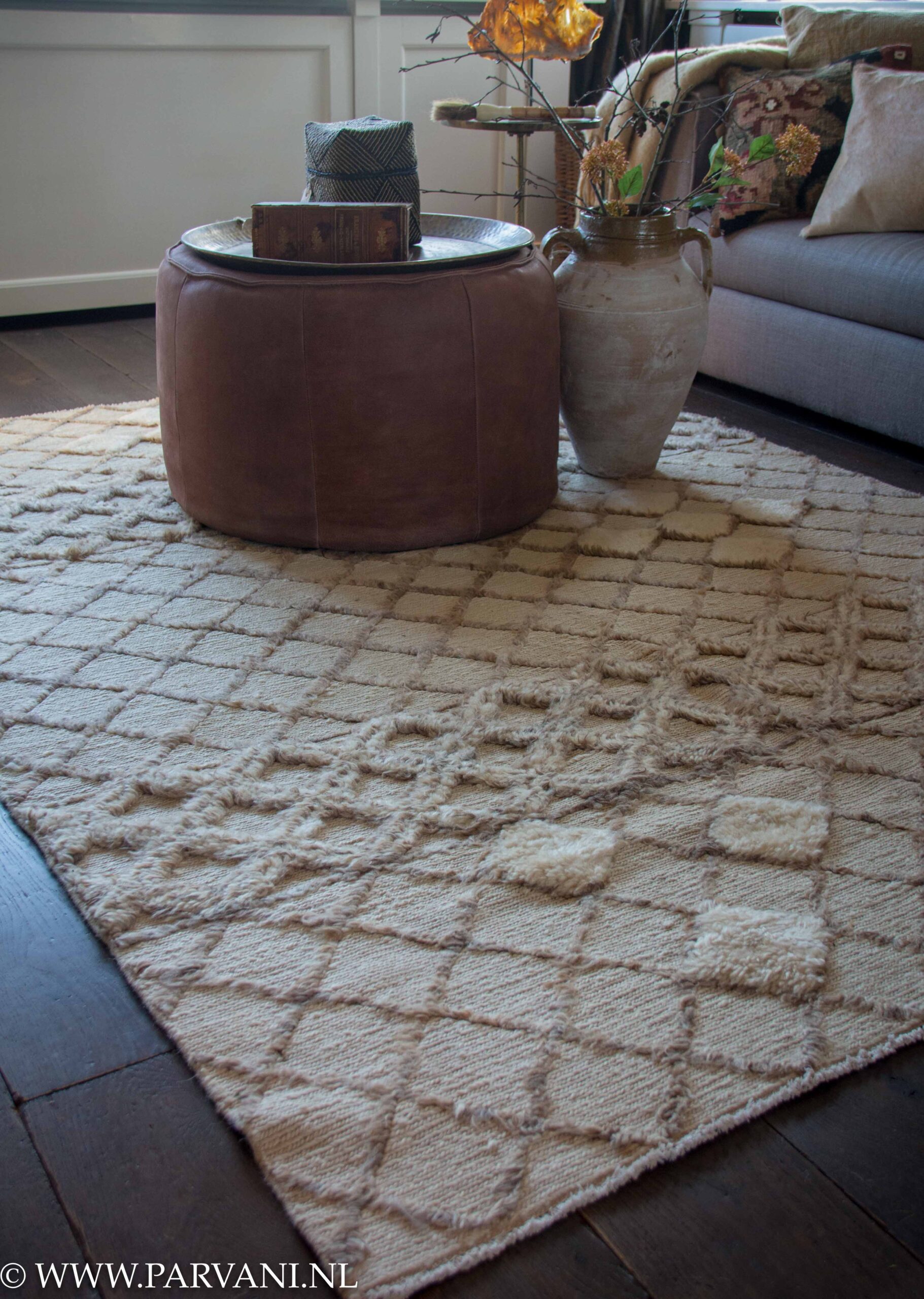 Mooi licht Berber tapijt uit Pakistan, het naturelle vloerkleed heeft de afmetingen: 168cm x 226cm prijs 919,- De ronde lederen poef is afkomstig uit de collectie van Fred de la Bretoniere, en verkrijgbaar in verschillende kleuren leer in de winkel.