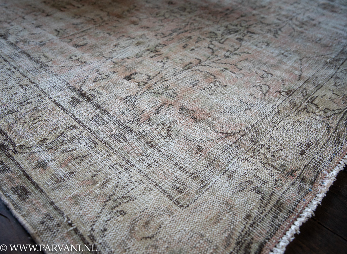 Oud roze, terra kleurig vintage tapijt met accenten en patroon in groen en donkerbruin. VERKOCHT