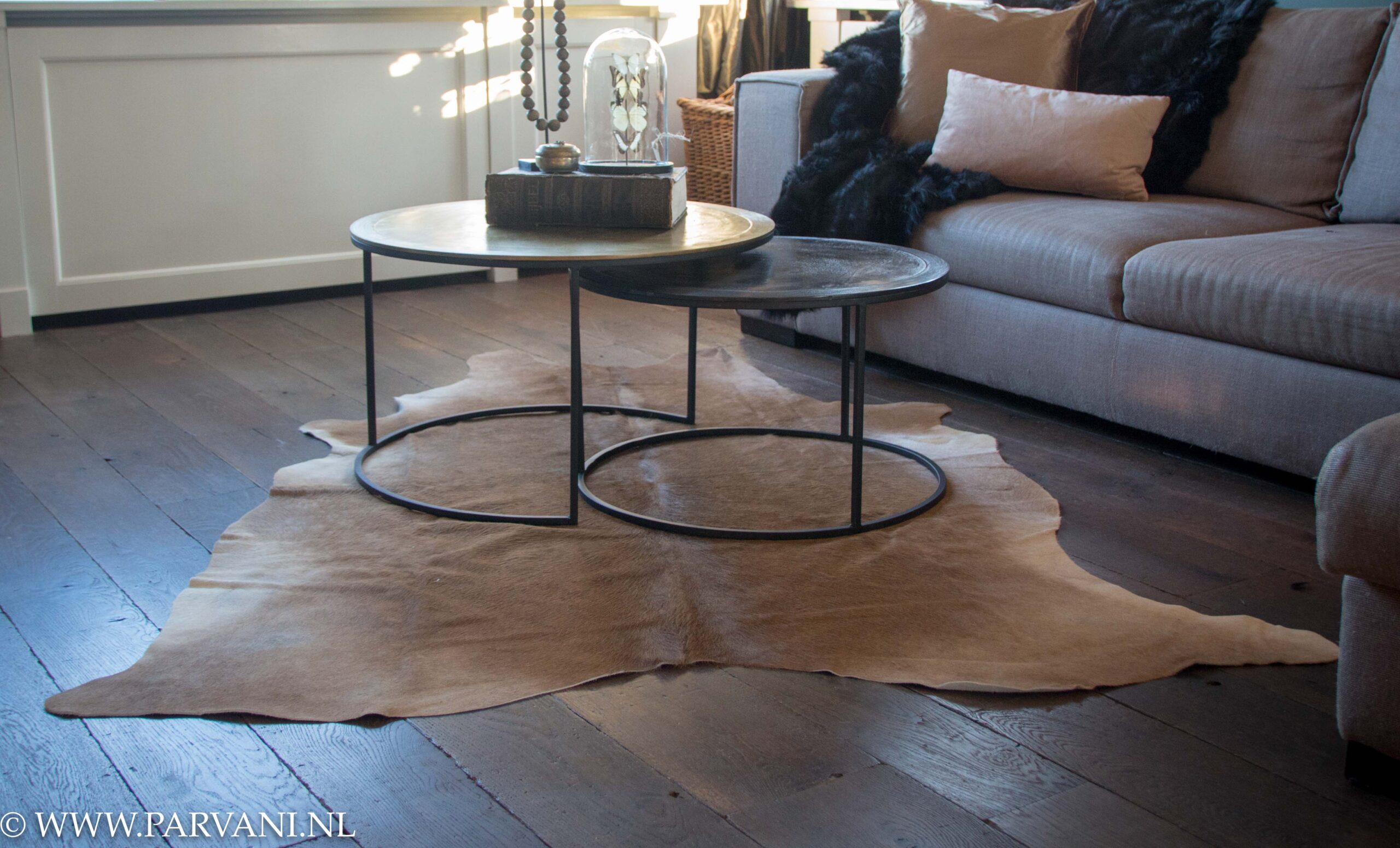 Mooie lichte koeienhuid, met een rustige licht bruin beige kleur. Prijs: € 450,-. We hebben altijd een aantal huiden op voorraad, stuk voor stuk uniek van kleur en afmeting. Ze zijn erg leuk om toe te passen in een ruimte met veel rechte vormen.
