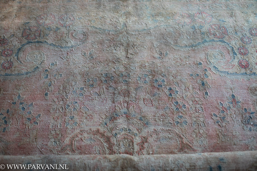 Een heel bijzonder en uniek tapijt in zachte kleuren en prachtig gedetailleerd patroon. De afmeting van dit tapijt is 256x 364 cm, de prijs is: € 3850,-.