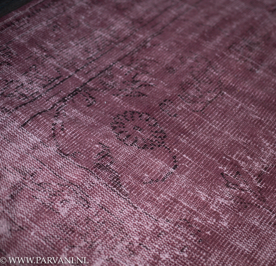 Vintage tapijt in bijzondere, warme tint. De kleur laat zich het beste omschrijven als rood roze burgundy. Eigenlijk heeft het een beetje de kleur van rode kool. Erop een rustig subtiel patroon in donkere kleur. De afmeting van dit kleed is 214x 285 cm, de prijs €1695,-.