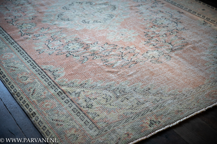 Vintage tapijt in terra roze en groene kleuren met mooi patroon