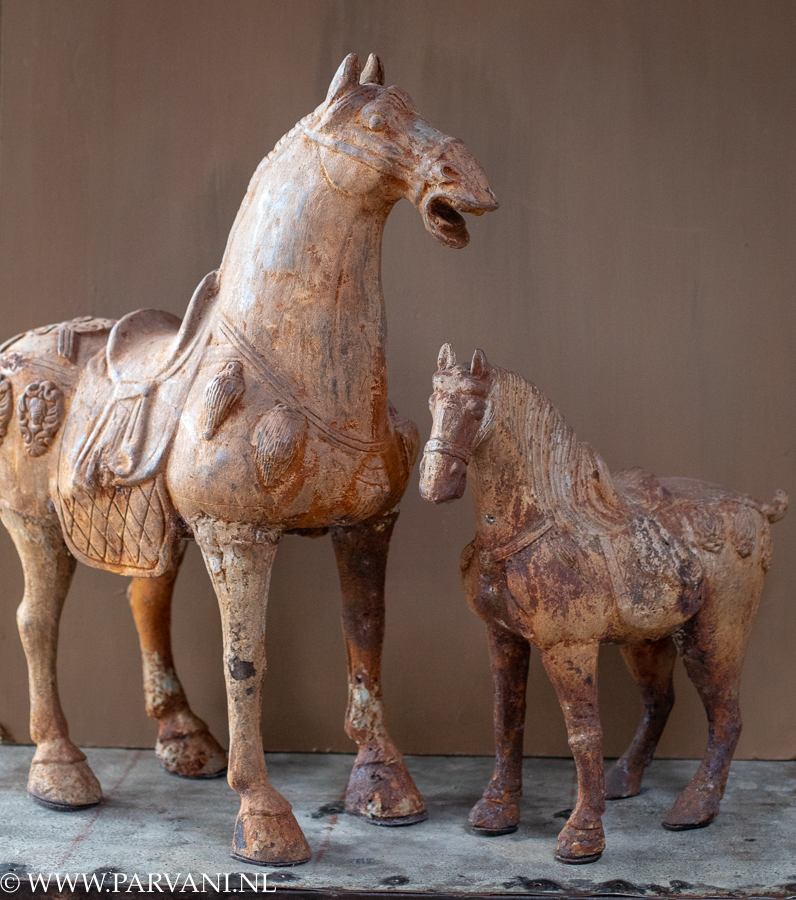 De paarden zijn gemaakt van gietijzer en hebben door de roest een mooie bruin/oranje/roze patina gekregen. Het grote paard is 67cm hoog, prijs: € 350,- Het kleinere paard is 43cm hoog, prijs: € 225,-