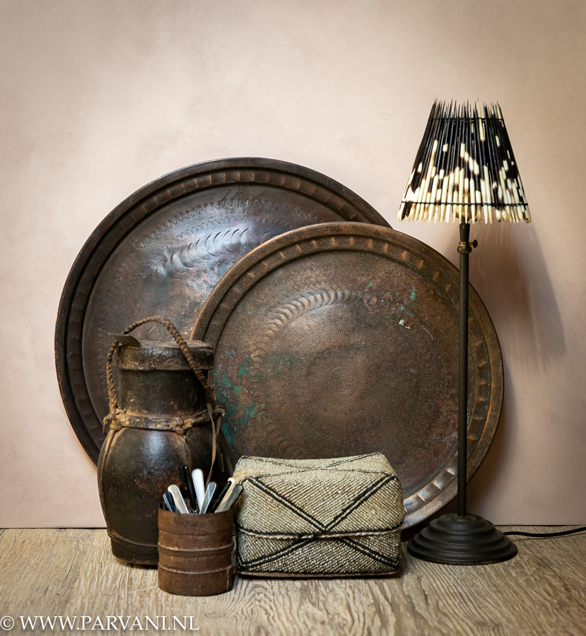 Oude dienbladen van koper met mooi groene patina en patronen, de grote is 57cm doorsnede, prijs €99,- De kleine is 48cm doorsnede en de prijs is €69,-Ernaast in hoogte verstelbare tafellamp Delphi (Frezoli) in bruin patina kleur €109,95 met daarop een zwart wit stekelvarken kapje €135,-Verder een oude Turkana container uit Kameroen, ijzer potje uit India en beige/ zwart kralenmandje uit Indonesië, afmeting 22x14x17 cm (lxbxh) prijs €79,- Achtergrond in oud roze kalkverf/ Marrakech Walls in kleur Skin Powder uit de collectie van Pure &, Original, bij ons op voorraad in de winkel.