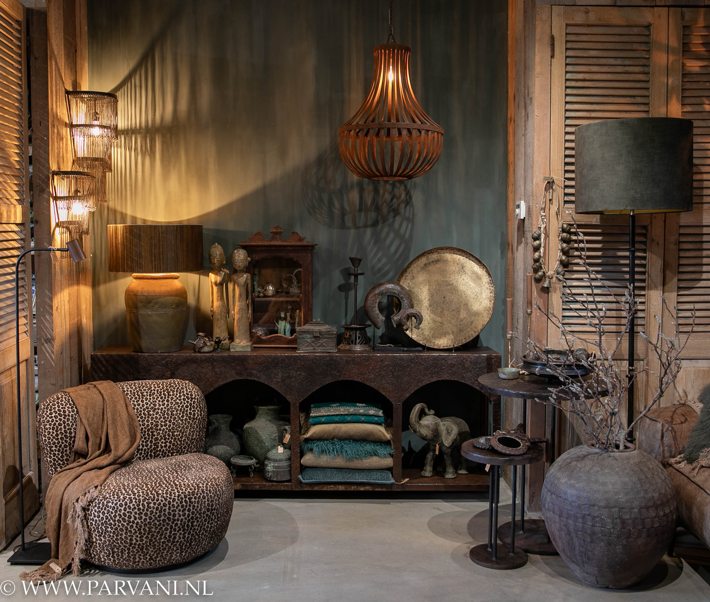 Uniek India kastje met deuren in groene kleur met Chinese tafellamp, accessoires en bruine ronde luipaard poef