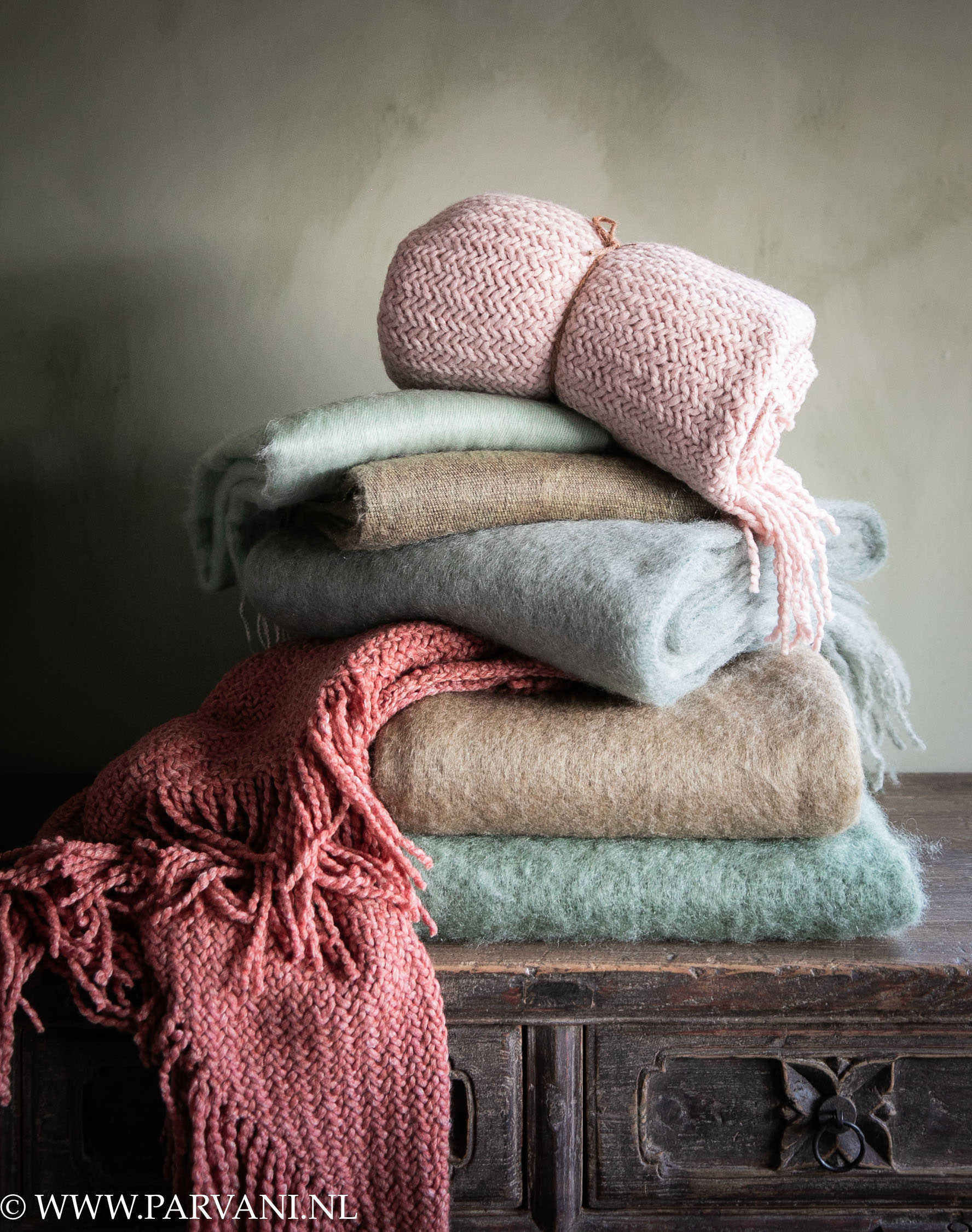 Poncho's, omslagdoeken van Manos del Uruguay met yakwollen sjaals en mohair wollen plaids met franjes in zachte pastel tinten groen, blauw en roze