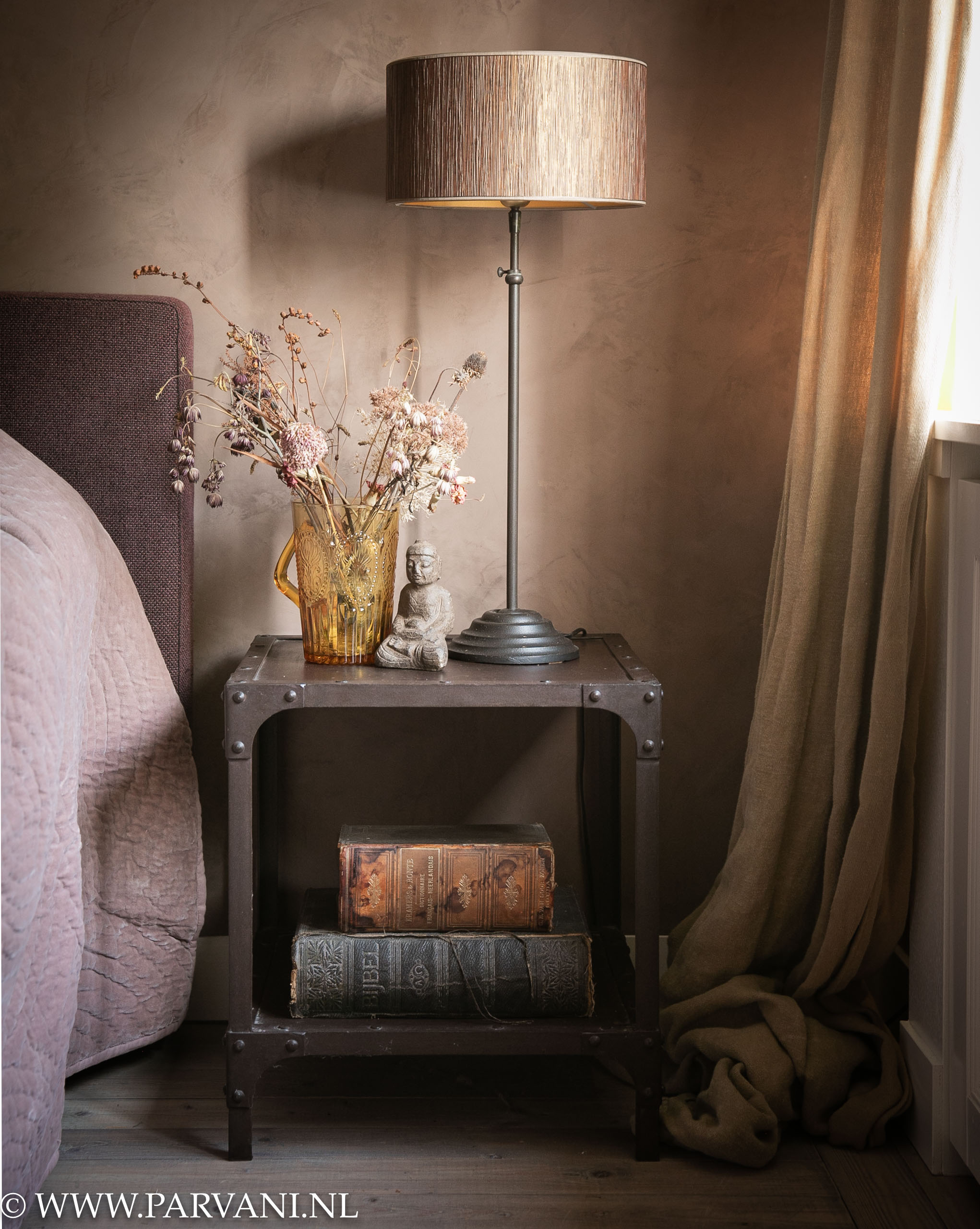Set Indiase nachtkastjes met houtsnijwerk en white wash patina, naturel linnen gordijn en bruine accessoires