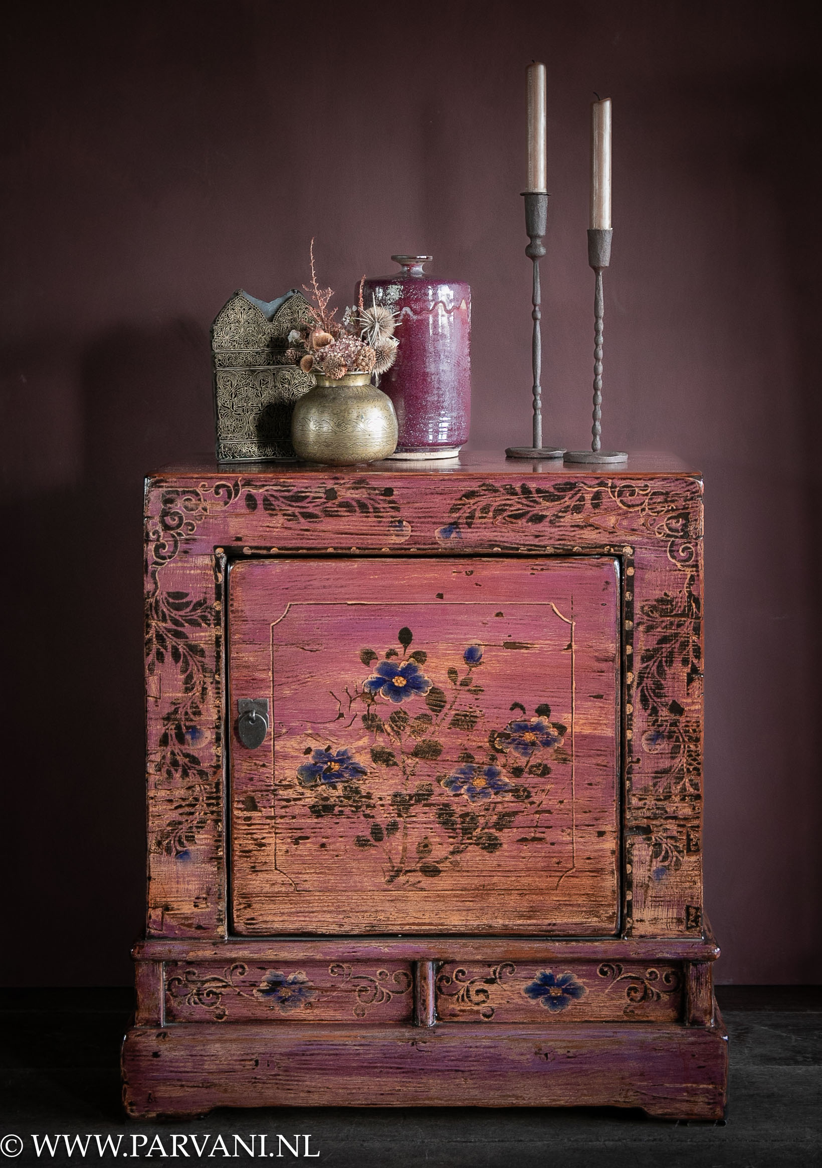 Set unieke kleurrijke Chinese nachtkastjes in roze paarse kleur met beschilderd floraal patroon met bloemen