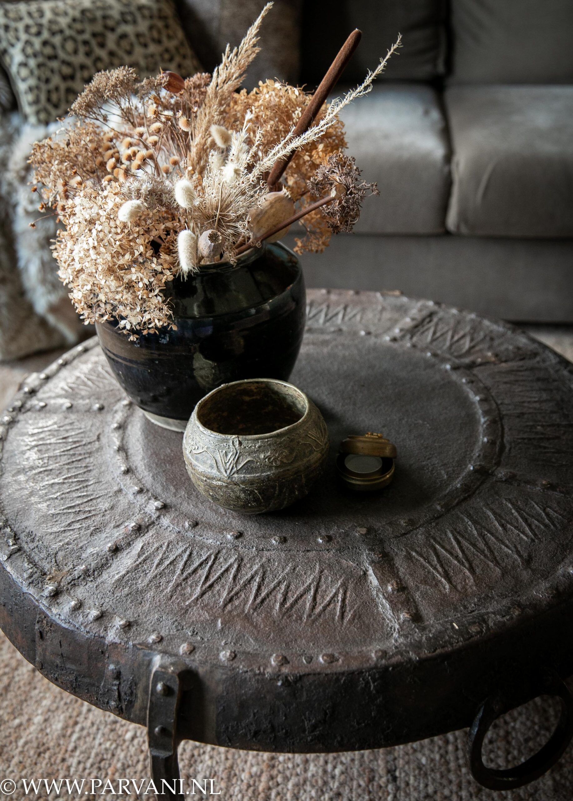 Stoere ronde salontafel uit India van donkerbruin metaal met gesmede pootjes. Leuke details zijn de 2 ringen aan de rand, en de ijzeren siernagels en beslag bovenop het blad. De tafel heeft een robuuste look en mooi geleefd patina. Toch door de smeedijzeren pootjes een elegante tafel. De diameter is 91cm en de hoogte is 36cm, prijs €695,-Erop een zwart porseleinen vaasje met droogbloemen uit China, prijs €109,- en bronzen rijstmaat en messing doosje met deksel uit India. Het oudroze bontplaid is €399,-, meer info over de kussens vind je op onze pagina kussens &, plaids. Op de vloer een handgeknoopt wollen tapijt uit onze tapijt collectie. Deze kunnen we leveren in vele structuren en kleuren, en heel fijn, ze worden op maat gemaakt.