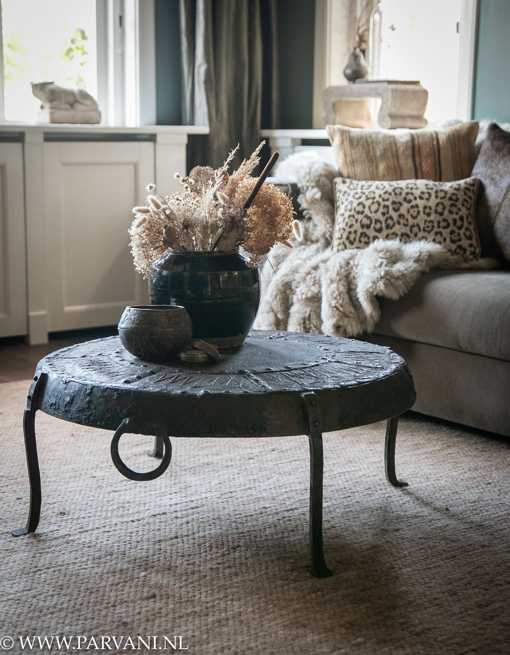 Stoere ronde salontafel uit India van donkerbruin metaal met gesmede pootjes. Leuke details zijn de 2 ringen aan de rand, en de ijzeren siernagels en beslag bovenop het blad. De tafel heeft een robuuste look en mooi geleefd patina. Toch door de smeedijzeren pootjes een elegante tafel. De diameter is 91cm en de hoogte is 36cm, prijs €695,-Erop een zwart porseleinen vaasje met droogbloemen uit China, prijs €109,- en bronzen rijstmaat en messing doosje met deksel uit India. Het oudroze bontplaid is €399,-, meer info over de kussens vind je op onze pagina kussens &, plaids. Op de vloer een handgeknoopt wollen tapijt uit onze tapijt collectie. Deze kunnen we leveren in vele structuren en kleuren, en heel fijn, ze worden op maat gemaakt.