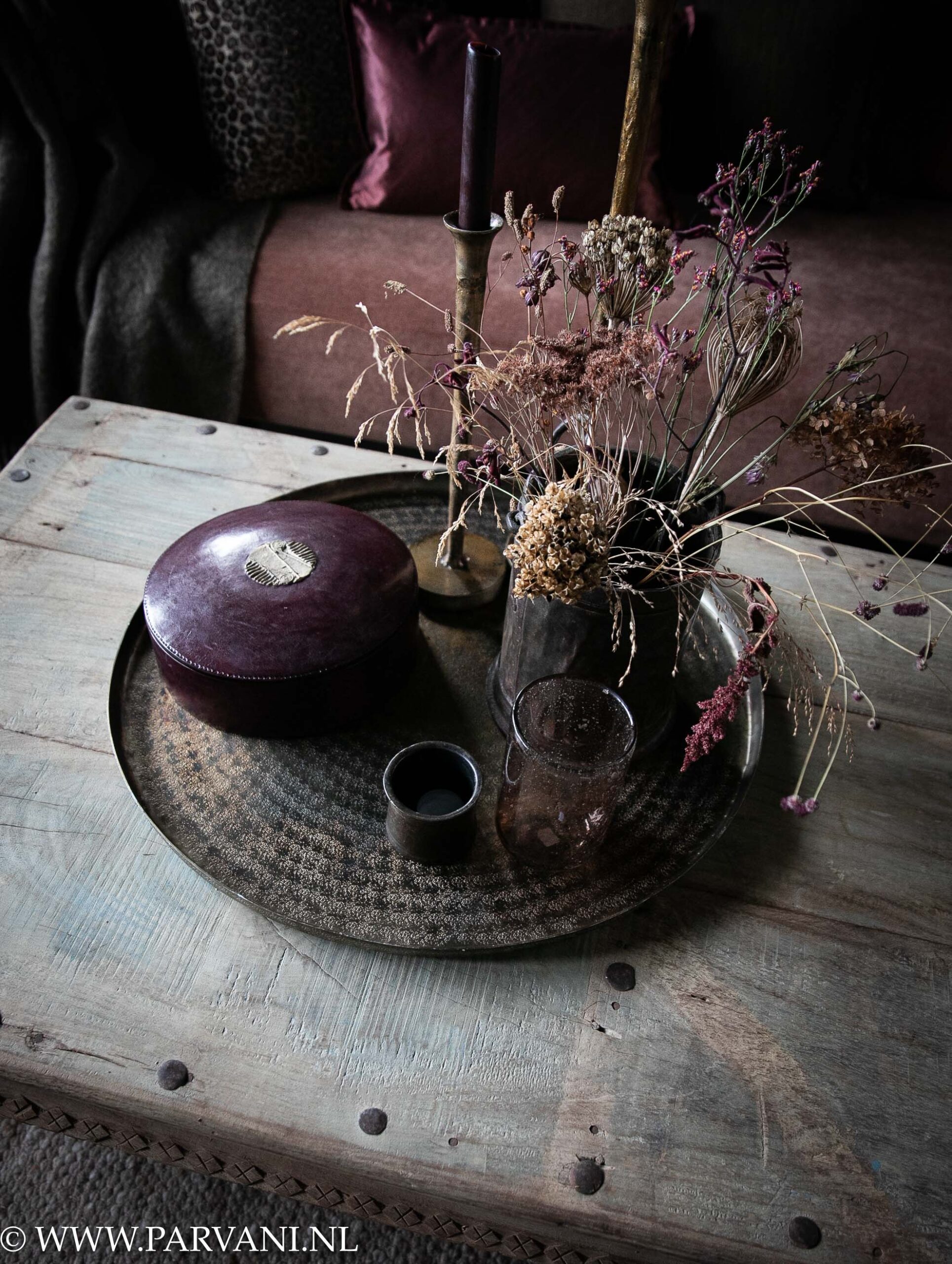 India salontafel coffeetable met houtsnijwerk en naturel vergrijsde kleur en metalen siernagels en beslag
