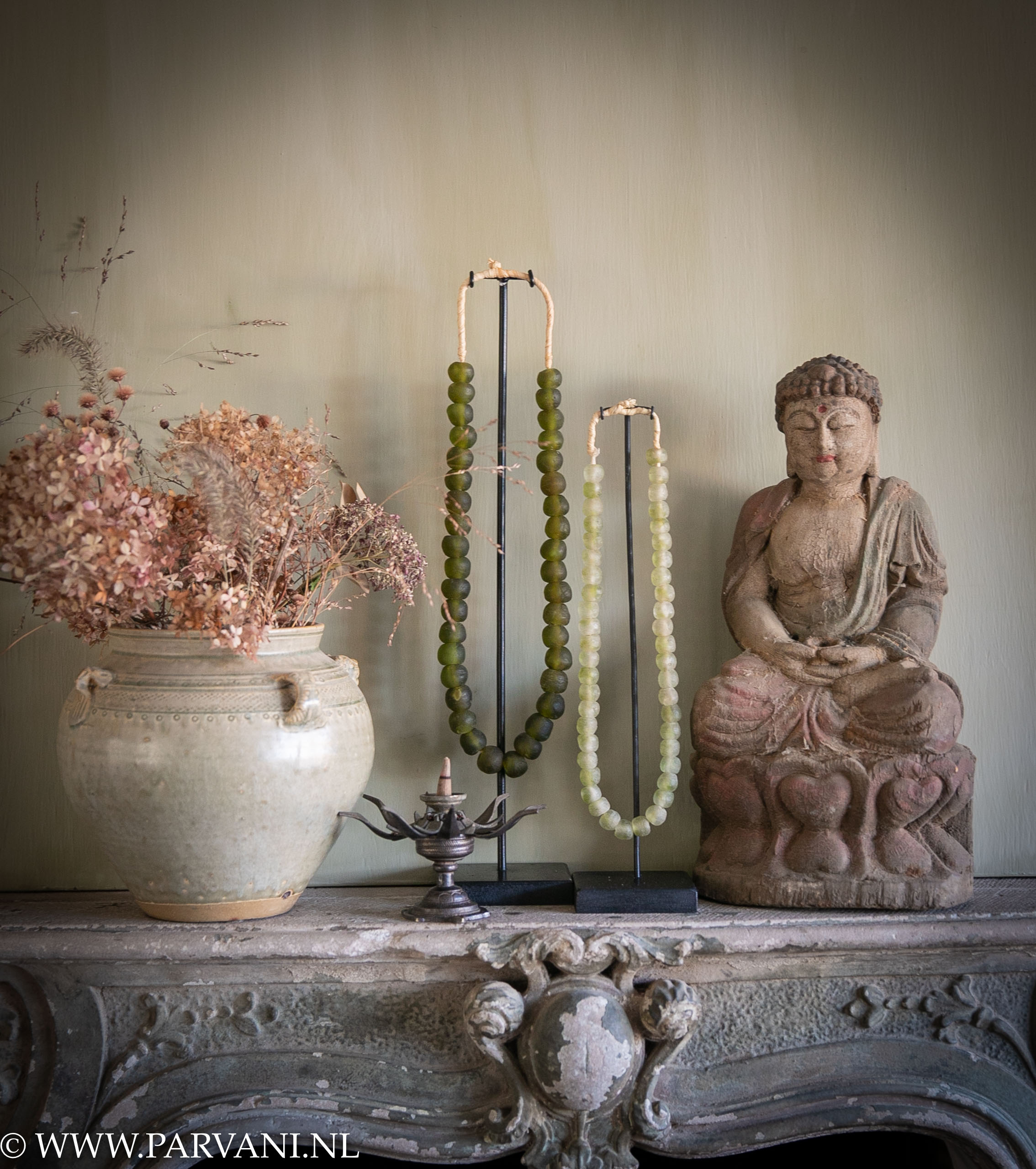 De muur boven de schouw is geschilderd met fresco kalkverf van Pure &, Original in de kleur Country Beige. Links op de schouw staat een zacht groen aardewerk potje uit China prijs €109,- Daarnaast een bronzen lotus bloem kandelaar uit Nepal waar je wierook kegeltjes in kunt branden €39,95.De glaskralen kettingen op standaard uit Ghana hebben we in diverse kleuren en maten, de kleine lichtgroene is 34 cm hoog, prijs €49,- en de grotere donkergroene 43 cm hoog en €69,-.De houten Buddha uit Nepal heeft een mooie rood roze patina, de hoogte is 37 cm en de prijs is €149,-