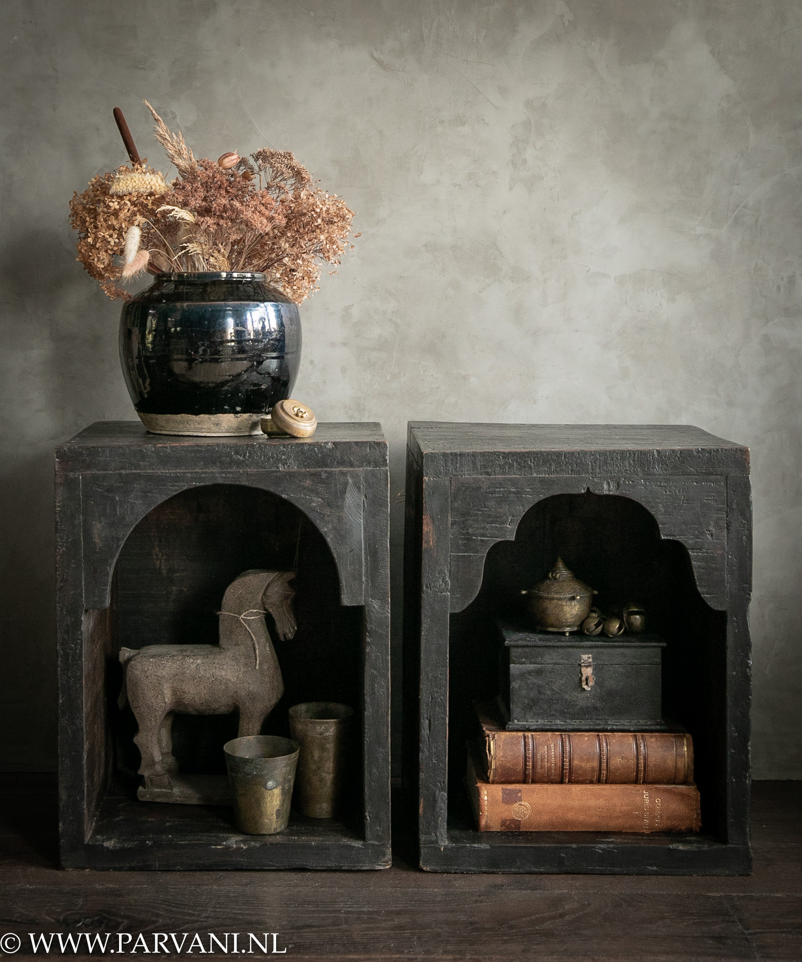 Set donkerbruin zwarte houten nachtkastjes met kubus vorm en open vak afkomstig uit India. Breedte 41cm, hoogte 51cm en diepte 32cm, prijs voor de set €595,- Ze hebben beiden een toog en open vak, en ook aan de achterzijde stevige metalen ogen waardoor je ze ook aan de wand zou kunnen hangen. Ook mooi te gebruiken als bijzetter of met een mooi beeld of object erin.In het linker kastje op deze foto een met de hand gehakt stenen paard uit China, prijs €99,- en erbij 2 oude messing bruidsbekers uit India. Erop een zwart porseleinen vaasje uit China met droogbloemen boeket, prijs van deze potjes vanaf €89,- En een klein brass doosje met deksel. In het rechter kastje op de oude boeken een rechthoekig zwart kistje uit India, prijs €27,95 en nog wat bronzen bellen en inktpotje. Op de wand kalkverf in de kleur Gritti aangebracht met de spaan, waardoor er een levendig betonlook effect ontstaat.