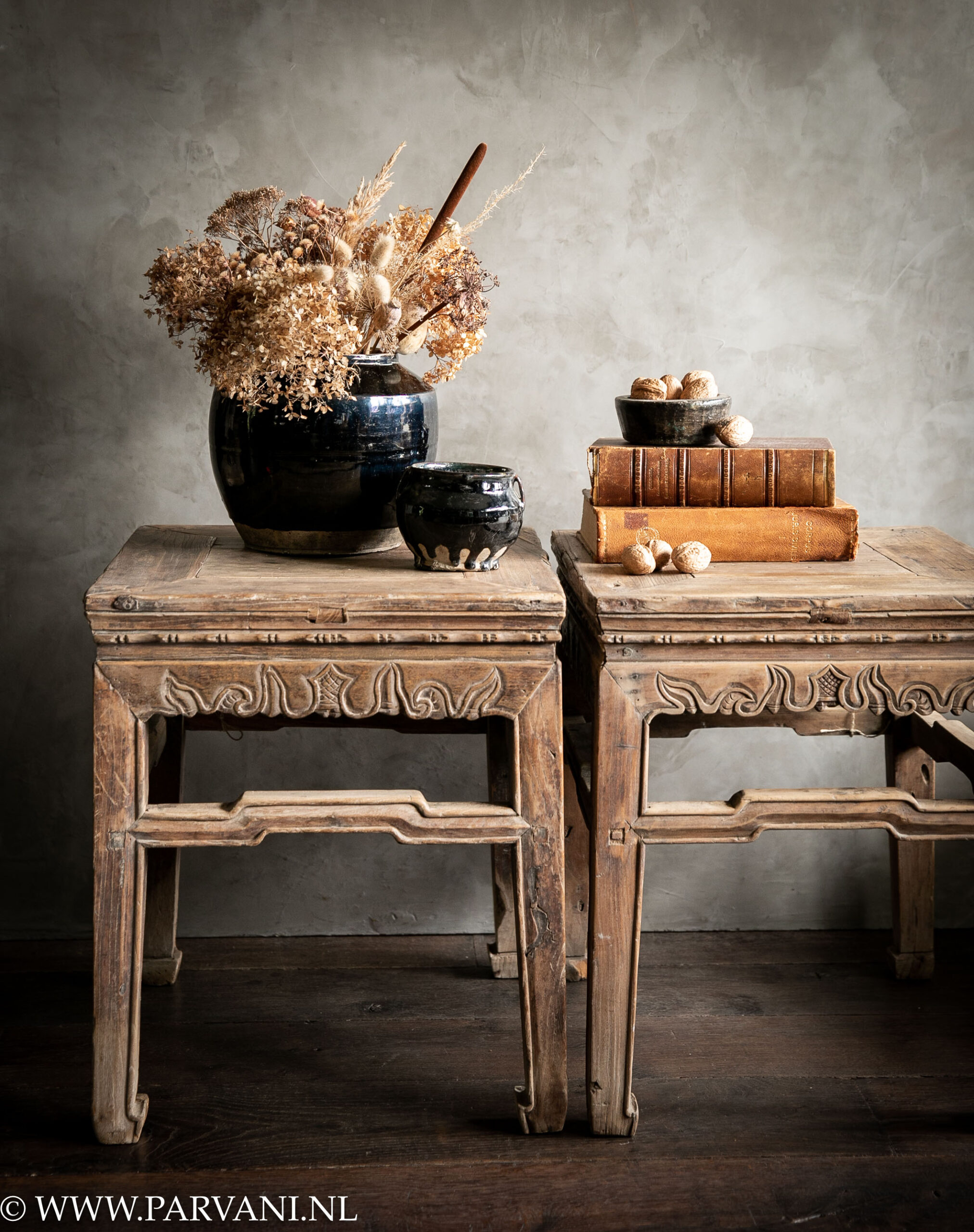 Set oude houten bijzet tafels uit China (streek Shanxi) in mooie naturel bruine kleur. Meubelen uit deze Shanxi streek zijn herkenbaar aan het decoratieve houtsnijwerk, leuke randjes aan de poten en mooie houtverbindingen.