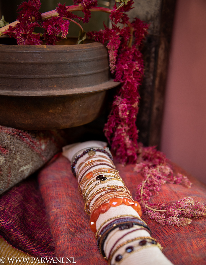 Sieraden A Beautiful Story in rood oranje kleuren op oud Indiaas bajot tafeltje