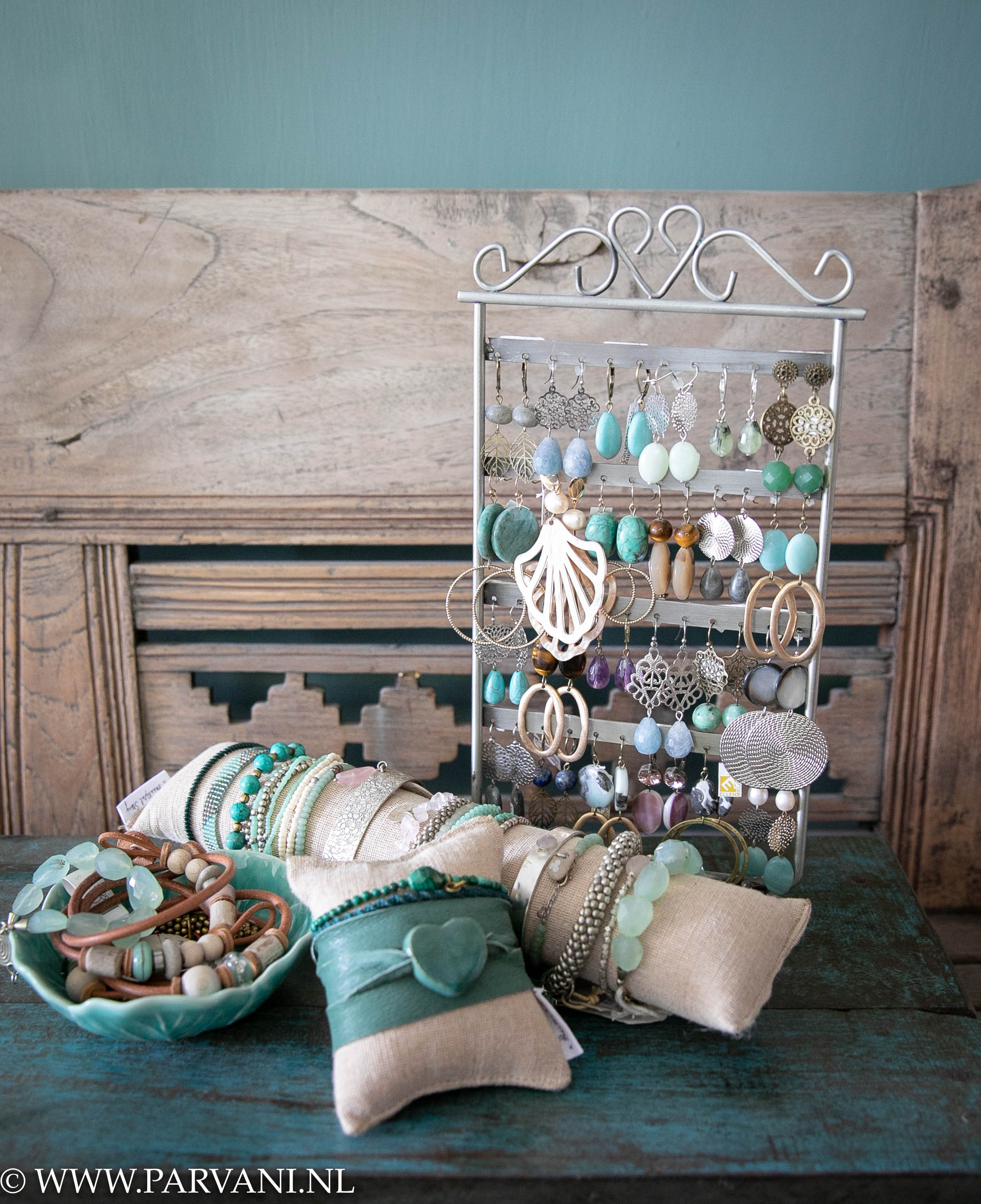 Bronzen drumtafel met oude schaal met fairtrade sieraden met edelsteen in roze, paars en groene kleuren