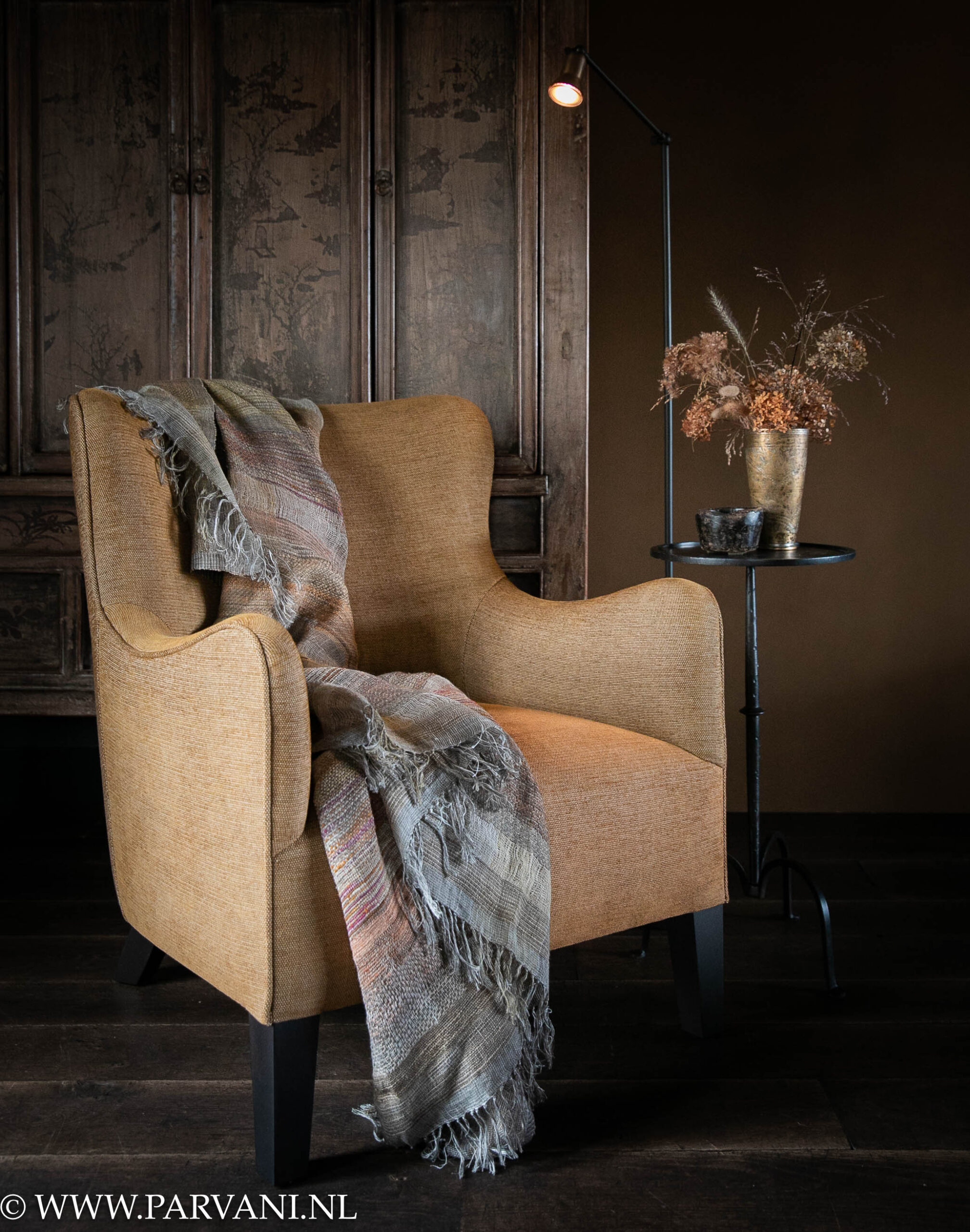 Elegante fauteuil Anniston in stoere stof in warme oker mosterd kerrie kleur met linnen plaid en koperen leeslamp Sirmione van Frezoli
