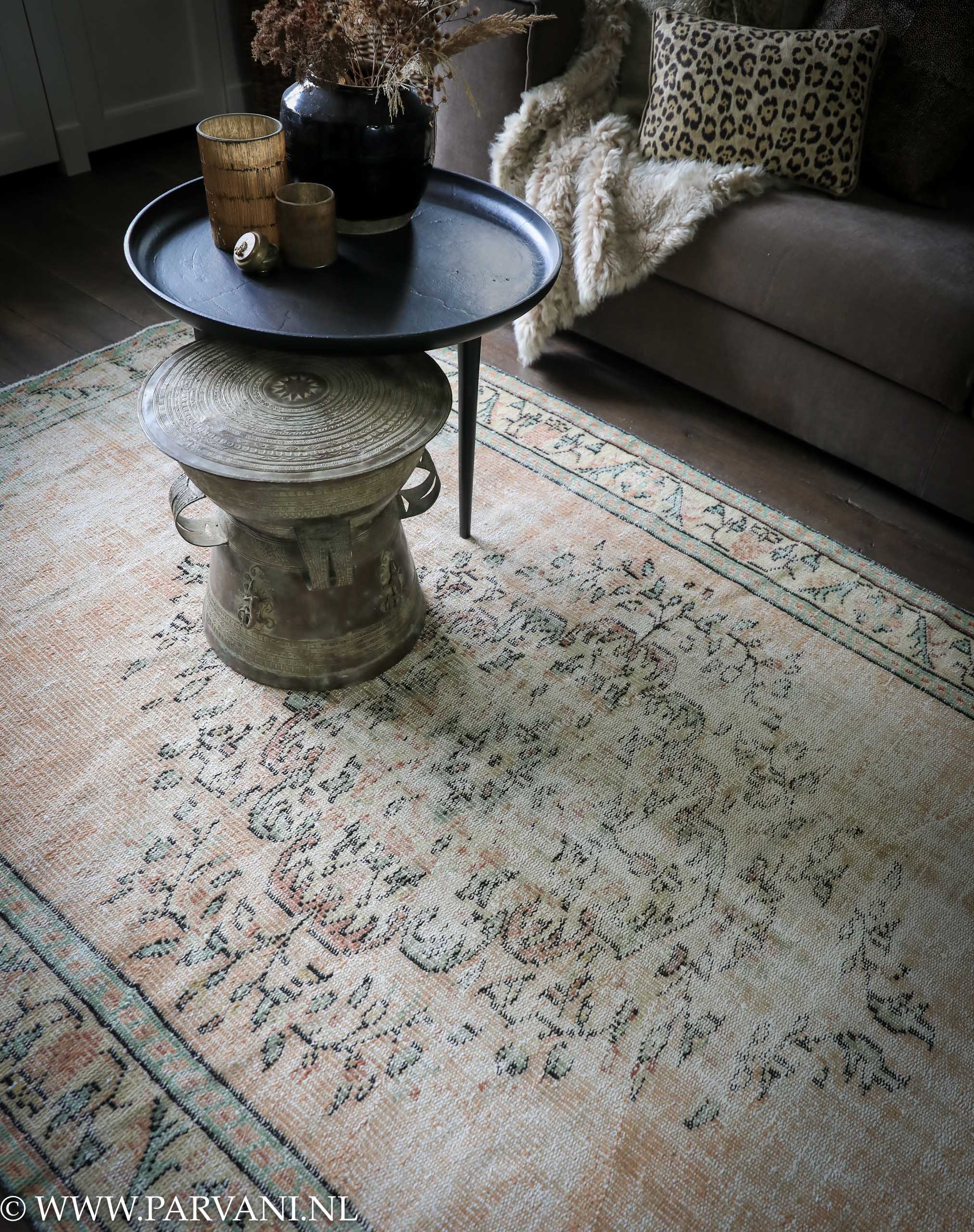 Vintage vloerkleed in mooie terra tint met groen, en patroon in donkere bijna zwarte kleur.