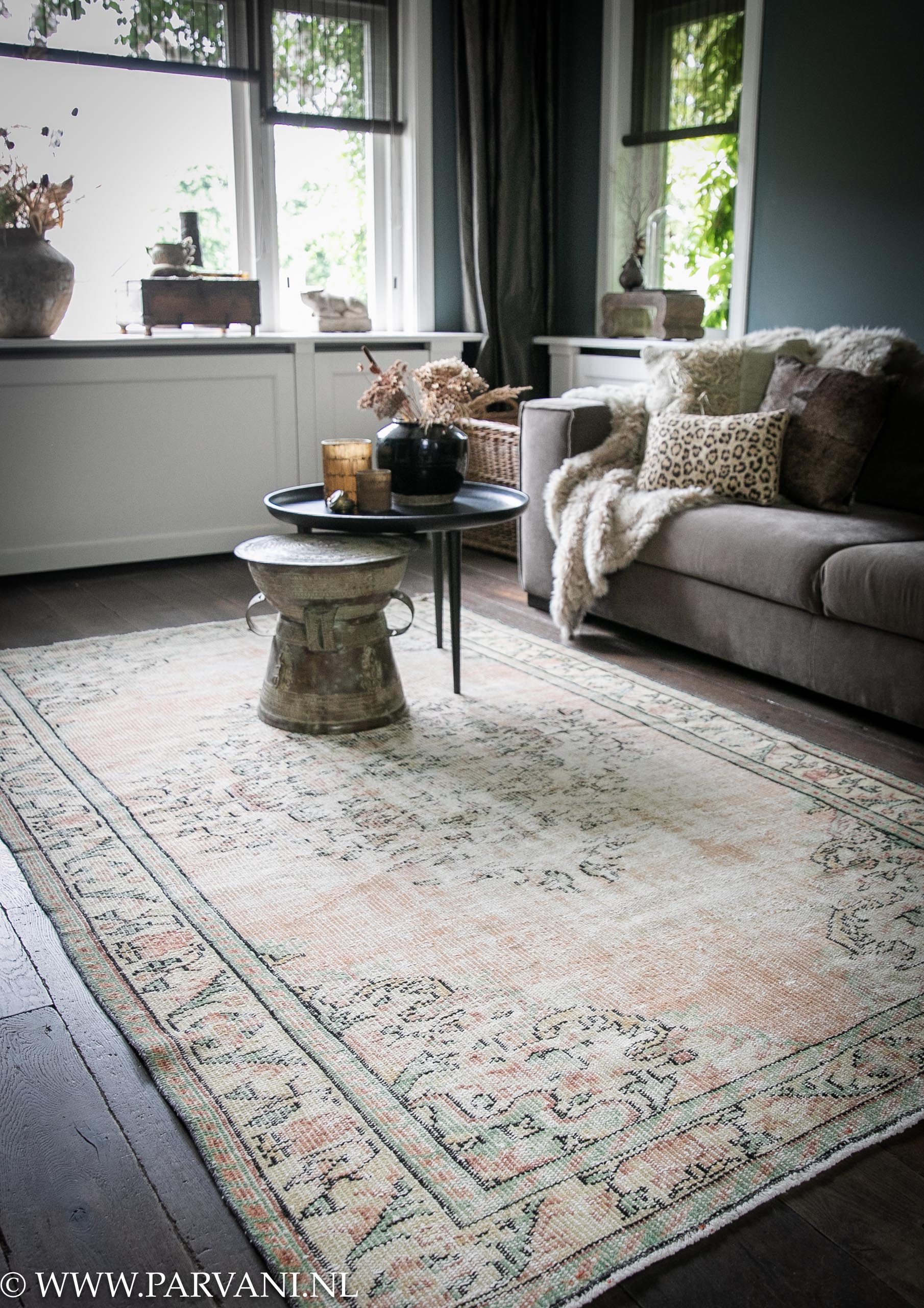 Vintage vloerkleed in mooie terra tint met groen, en patroon in donkere bijna zwarte kleur.