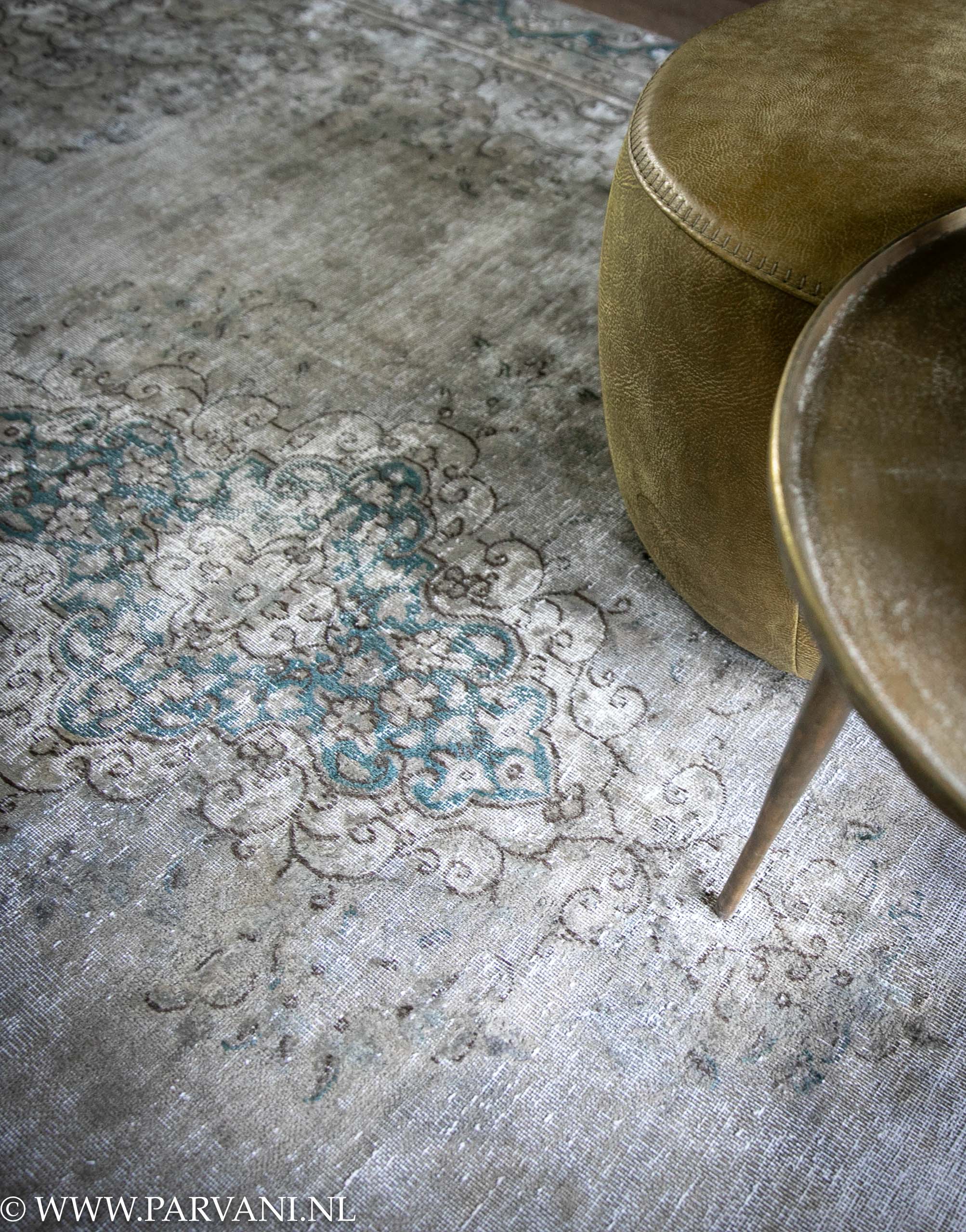 Vintage tapijt uit Iran met mooie rustige grijs groene/ blauwe basiskleur met patroon in donkere kleur met accenten in petrol blauwe tinten. De afmeting is 201x 304cm en de prijs is €2529,- VERKOCHT Op het tapijt een rond lederen poefje met brass bijzettafel, meer info daarover op onze pagina kleinmeubelen.