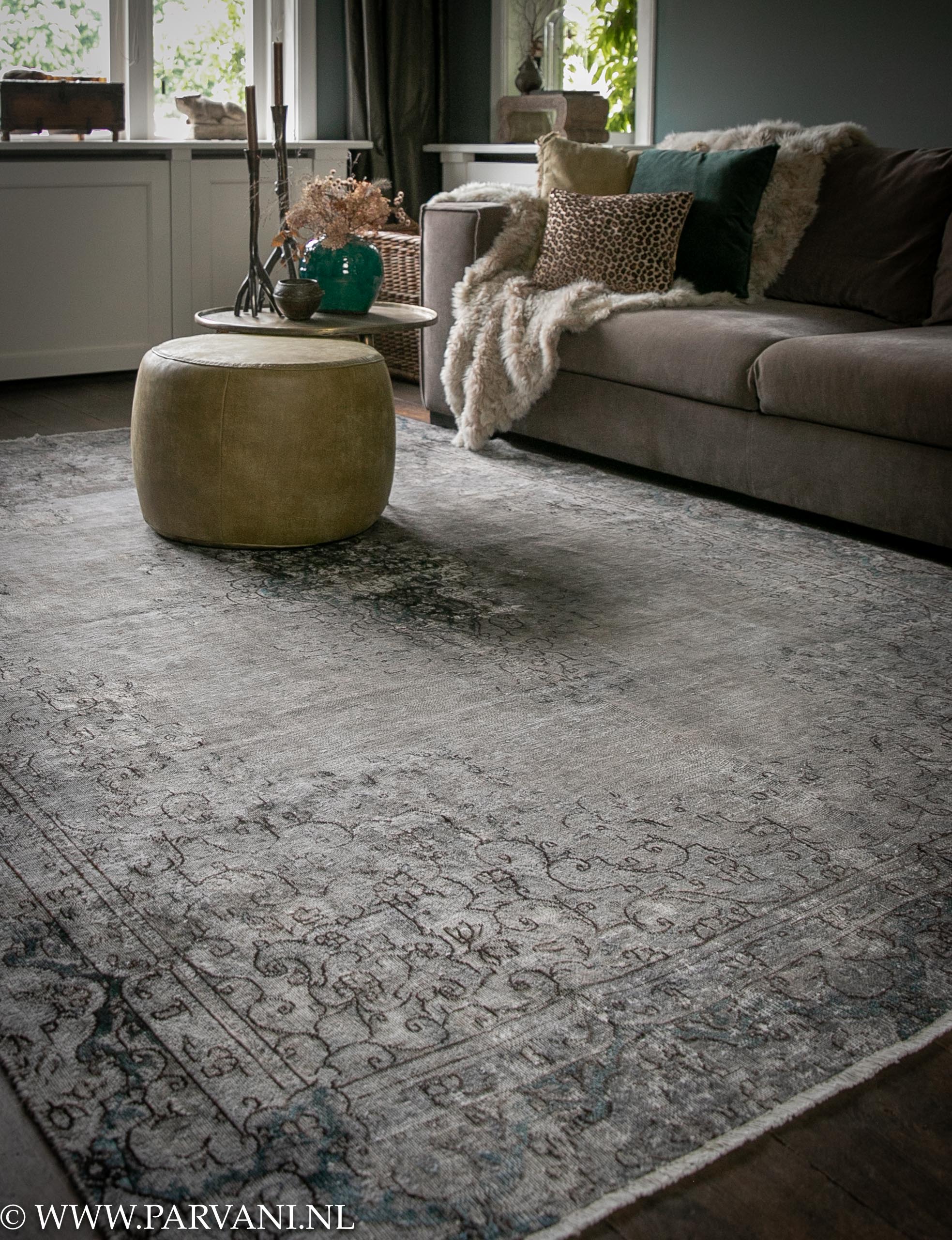 Vintage tapijt uit Iran met mooie rustige grijs groene/ blauwe basiskleur met patroon in donkere kleur met accenten in petrol blauwe tinten. De afmeting is 201x 304cm en de prijs is €2529,- (VERKOCHT) Op het tapijt een rond lederen poefje met brass bijzettafel, meer info daarover op onze pagina kleinmeubelen.