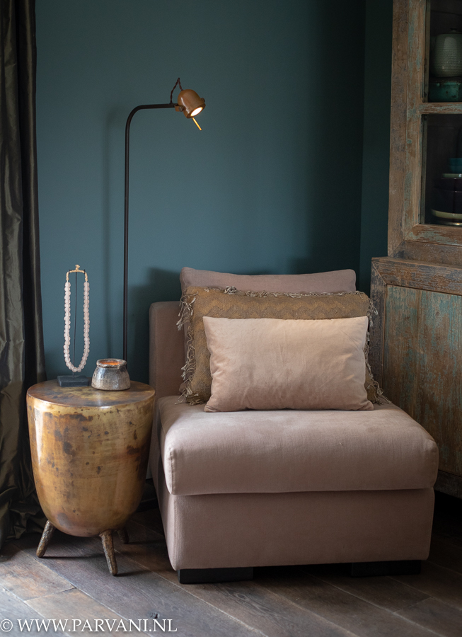 Metalen bijzettafeltje afgewerkt in goud/messing/roest kleuren, het ronde tafeltje heeft 3 pootjes. Afmetingen: 36cm doorsnede, 49cm hoogte. Prijs: € 189,- (tijdelijk niet leverbaar..) Leeslamp Spezia in bruin gepatineerd koper finish. Afmetingen: 135cm hoog, prijs: 304,- prijs incl. dimmer: 326,50 de leeslamp is ook leverbaar in loodgrijs en mat zwart. Oud-roze glazen kralenketting op standaard uit Ghana. Prijs: € 49,- Kussenhoes “,zigzag”, van Hoffz, 40cm x 60cm in oker/bruin met franjes. Prijs: € 57,50 Velours kussen 30cm x 50cm Prijs: € 29,95