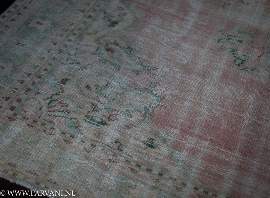 Vintage vloerkleed ondergrond in zacht roze tinten, met daarop fraaie patronen in diverse kleuren groen en turquoise. De afmeting is 180 x 278cm, en de prijs is €1395,- VERKOCHT